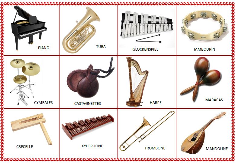 | Cymbales | Mandoline | Tambourin | Xylophone |